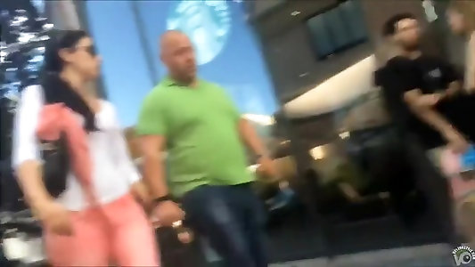 Bare-chested street bigboob gal walking and bouncing