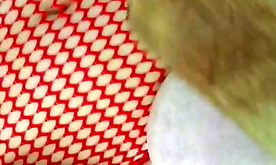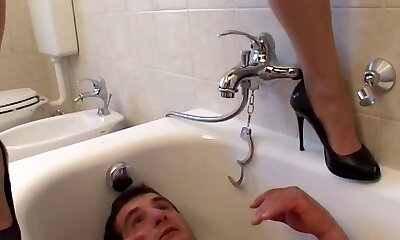 A supreme slave lies in red pantyhose and waits for Madame to take care of him