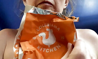 Convenience licking! Heartbroken Rachel Wriggler fights to hold back the tears as she eats Popeyes for breakfast at 6pm