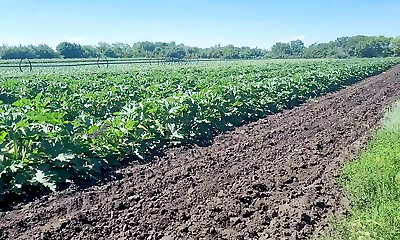 A slender brunette saw a field in which large zucchini grow, she was not at a loss and plucked a few pieces