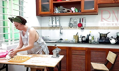 Ravioli Time! Bare Cooking. Regina Noir, a nudist cook at naturist hotel resort. Nude maid. Nude housewife. Camera 1